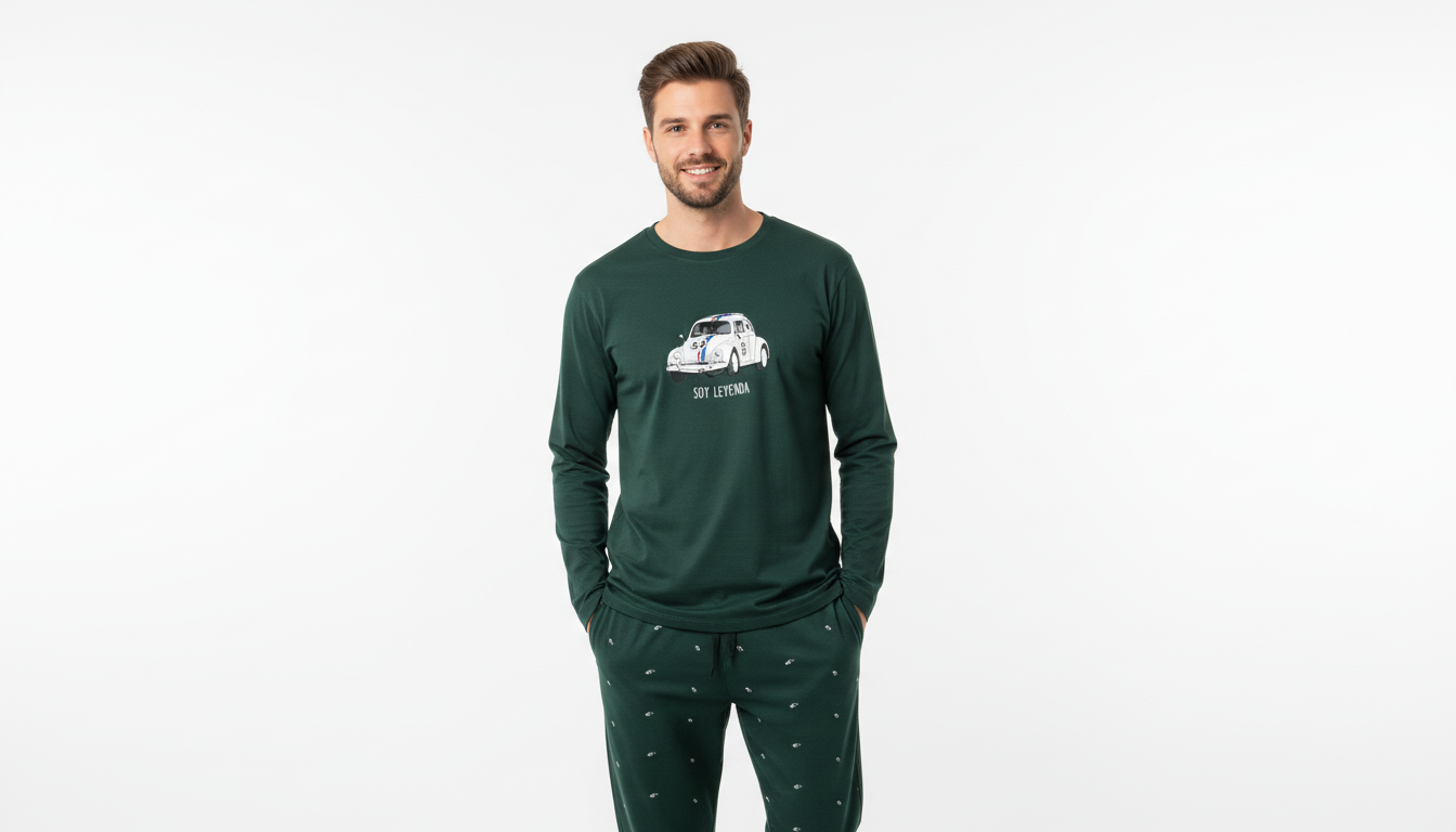 El pijama de hombre de la marca DARK ELEPHANT en color verde es una opción cómoda y moderna para descansar con estilo durante las noches de entretiempo. La camiseta de manga larga presenta un original dibujo de coche en el pecho acompañado de la frase “soy leyenda”, aportando un toque divertido y desenfadado.