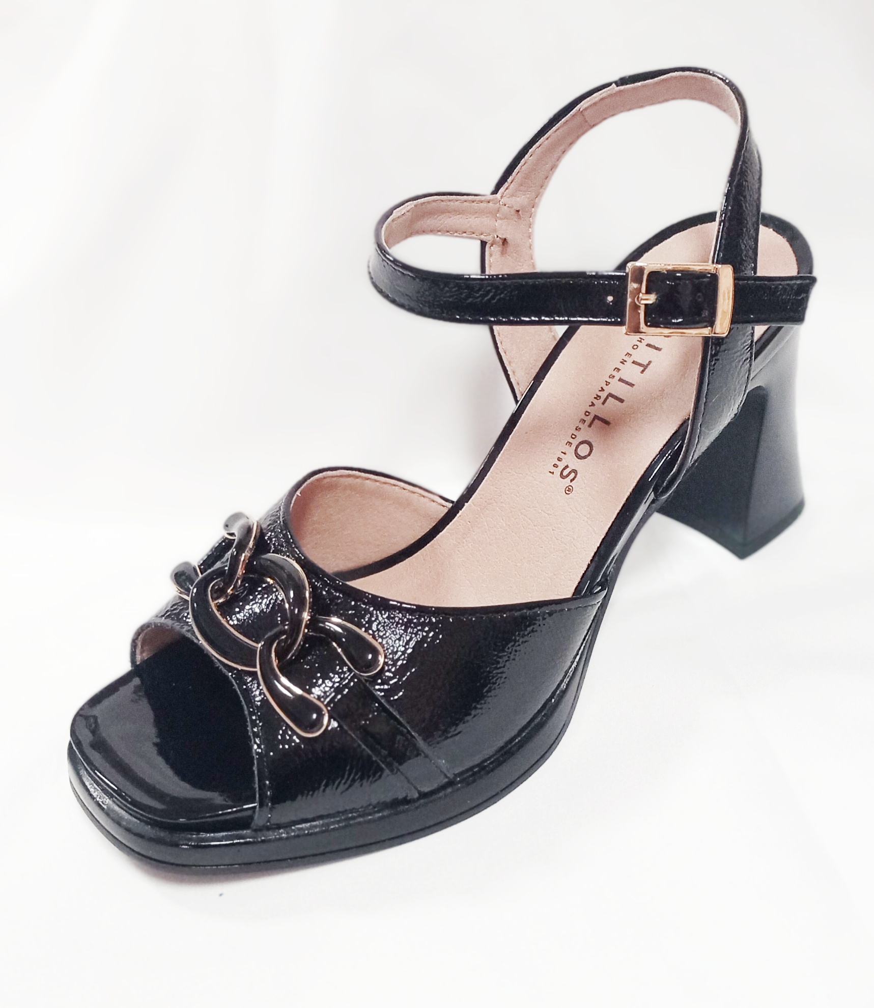Fabricada en piel charol negro, aporta un acabado brillante y refinado. Incorpora pulsera al tobillo con hebilla ajustable que garantiza una sujeción firme y estiliza el pie. En la parte delantera destaca un elegante detalle de cadena que añade un toque moderno y distinguido.